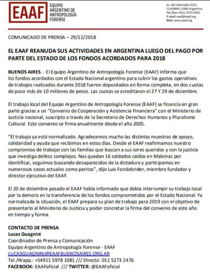 El Equipo Argentino de Antropología Forense (EAAF), que desde hace casi 35 años trabaja en la búsqueda e identificación de personas desaparecidas durante el terrorismo de Estado, anunció hoy a través de un comunicado que, tras el pago de lo adeudado por el régimen macrista, retomará sus tareas.
